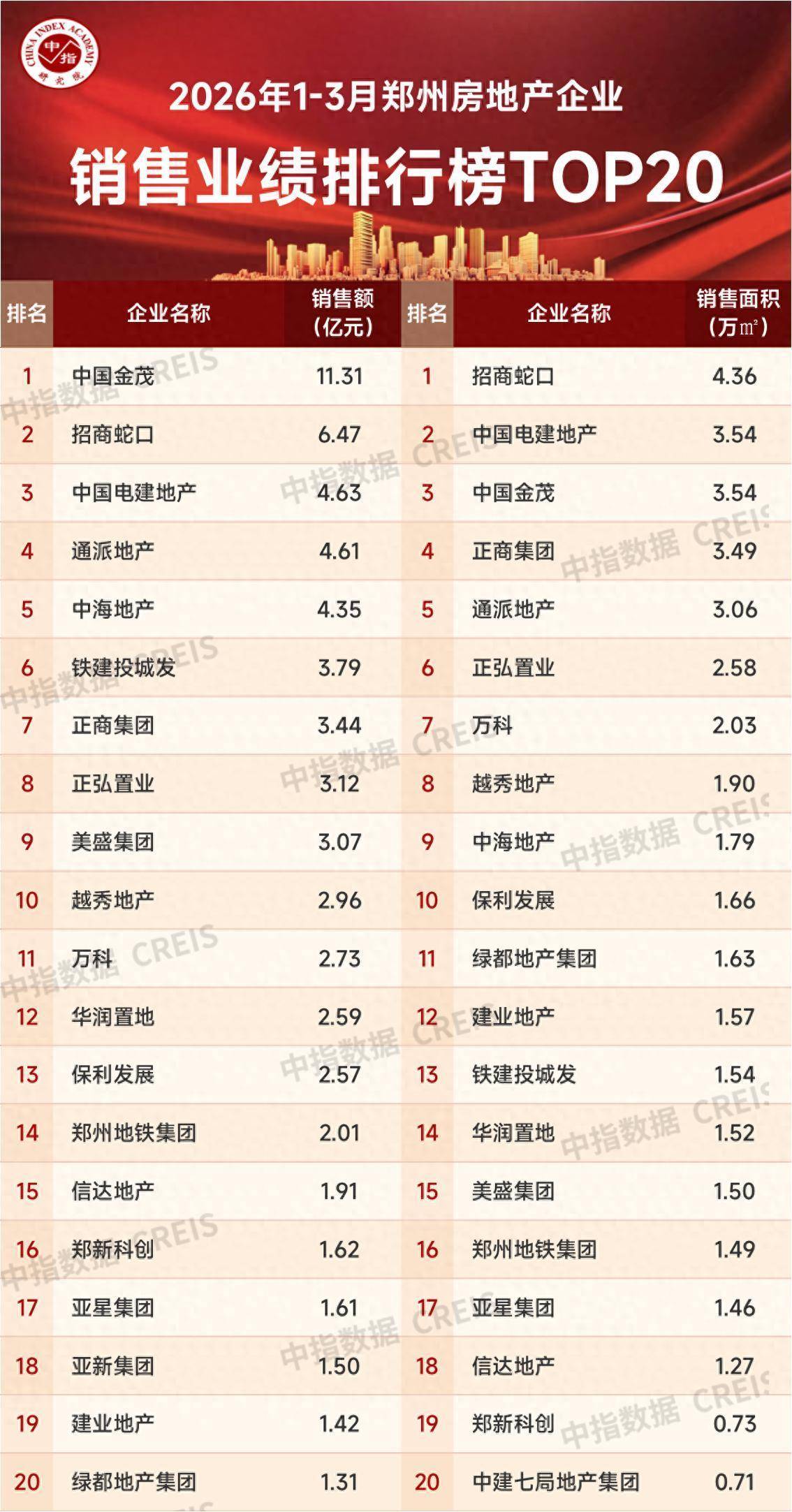 【大河财立方消息】4月1日,中指研究院发布2026年1~3月郑州房地产企业销售业绩TOP20。